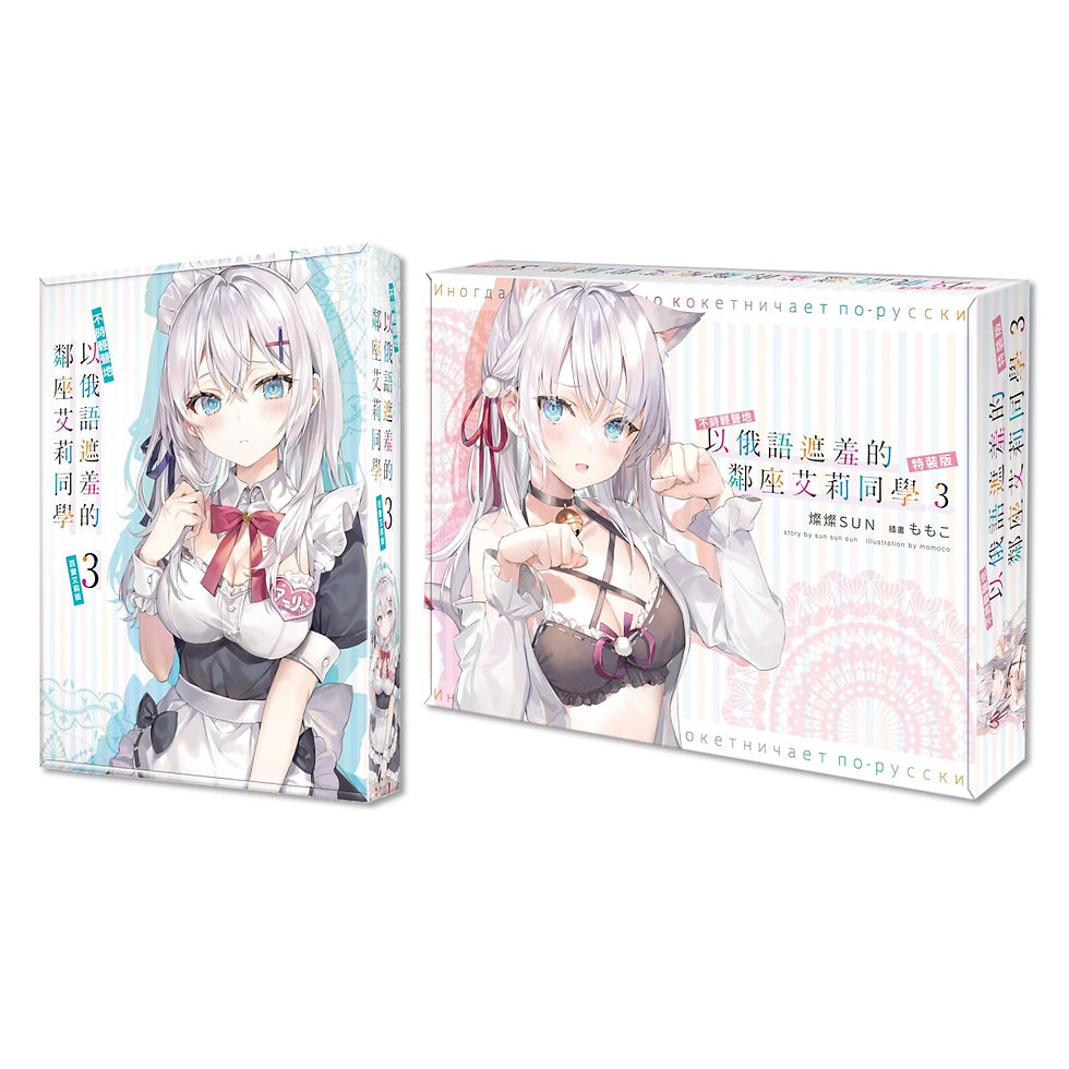 相互抱持糾結的情感,和俄羅斯美少女高中生譜出止不住笑意的青春戀愛喜劇續篇登場!男主角「政近」俄語聽力達到母語水準,但全校學生心目中的女神──才貌雙全俄羅斯銀髮美少女「艾莉」同學卻毫不知情,今天也以甜蜜的俄語表現嬌羞的一面!《不時輕聲地以俄語遮羞的鄰座艾莉同學 (3)》【特裝版】收錄特典:性感可愛的艾莉喵「萬用墊」、誘人純白襯衫造型「壓克力鑰匙圈」及一次收藏滿滿艾莉珍貴畫面的「4入寫真卡組」;【百變艾莉版】收錄特典:嬌羞俏女僕艾莉「長型掛軸」、活力啦啦隊艾莉「特製長型磁鐵」及艾莉喵「大尺寸壓克力桌繪」。預購期間內於各通路預購《不時輕聲地以俄語遮羞的鄰座艾莉同學 (3)》特裝版or百變艾莉版任乙套,並加價NT$200元,即可加購限定特典:「隨身口罩夾」乙個。