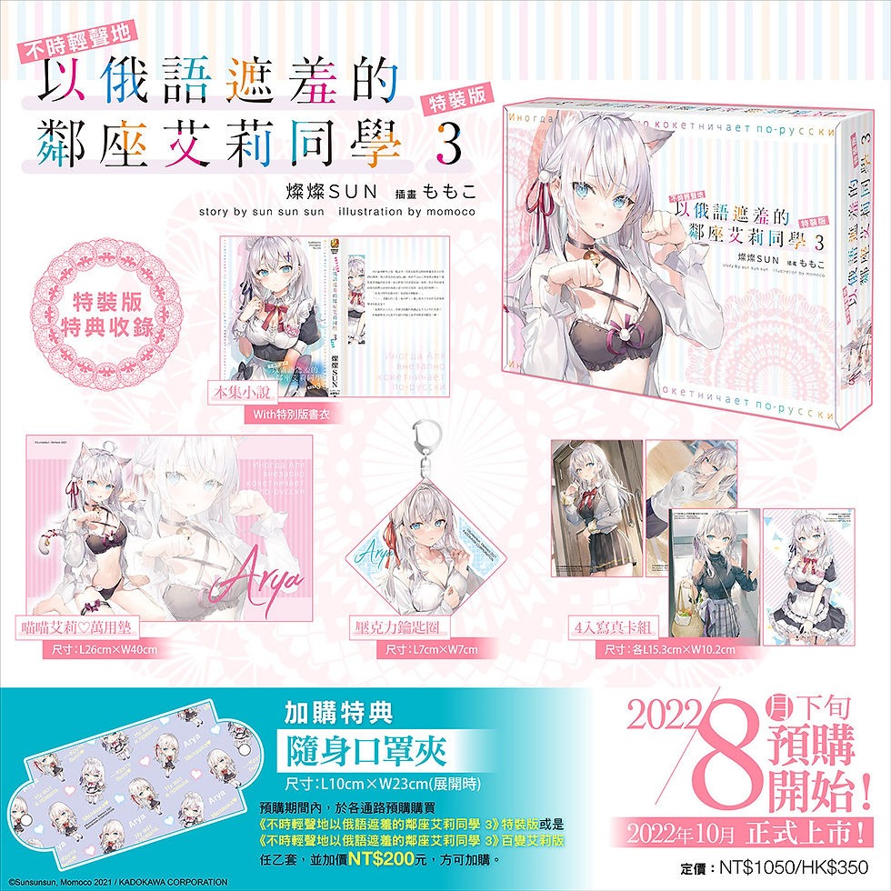 2020年度紙本小說新刊銷售額&電子書首周下載數歷代雙料冠軍!與俄羅斯美少女高中生譜出的超人氣青春戀愛喜劇續刊《不時輕聲地以俄語遮羞的鄰座艾莉同學 (3)》台灣角川將於十月同步推出含新刊及多款特典的特裝版&百變艾莉版!【特裝版】收錄特典「萬用墊」、「壓克力鑰匙圈」及「4入寫真卡組」,將開放全通路預購;【百變艾莉版】收錄特典「長型掛軸」、「特製長型磁鐵」及「大尺寸壓克力桌繪」,僅限於台灣角川官網預購,雙版本皆收錄「本集小說with特別版書衣」及「收藏書盒」各乙款。自即日起開放事前預購至9/6(二),預購《不時輕聲地以俄語遮羞的鄰座艾莉同學 (3)》特裝版或百變艾莉版任乙套,還可加購限定特典:「隨身口罩夾」乙個。