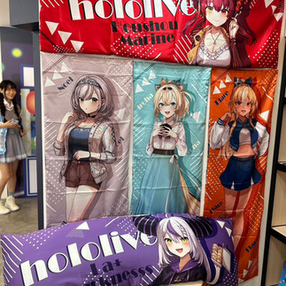 除了餐點之外,還有一大重頭戲,當然就是超香的周邊。只要於餐廳用餐就可以於咖啡廳現場購買由「FANFANS粉粉」設計的一系列以主題立繪延伸的周邊商品,包含幻彩壓克力立牌、滑鼠墊、毛巾、掛軸、抱枕、行動電源、無線充電盤、T-shirt、無框畫...等滿滿新品,三期生及秘密結社holoX通通都有,粉絲們準備瘋買。